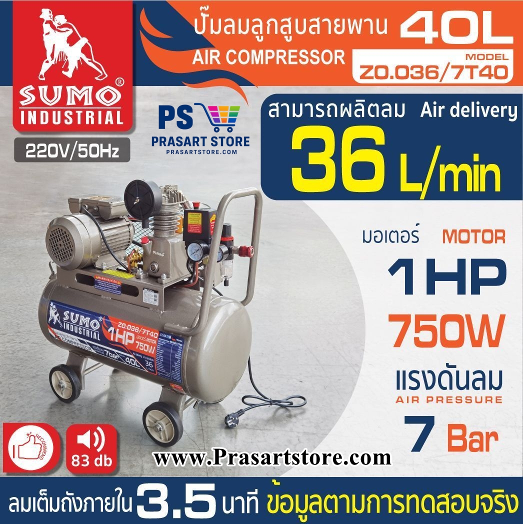 ปั๊มลมลูกสูบสายพาน 40 ลิตร มอเตอร์ 1HP 750W ลวดทองแดง 100% แรงดันลมสูง ผลิตลมเต็มถังภายใน 3.50 นาที