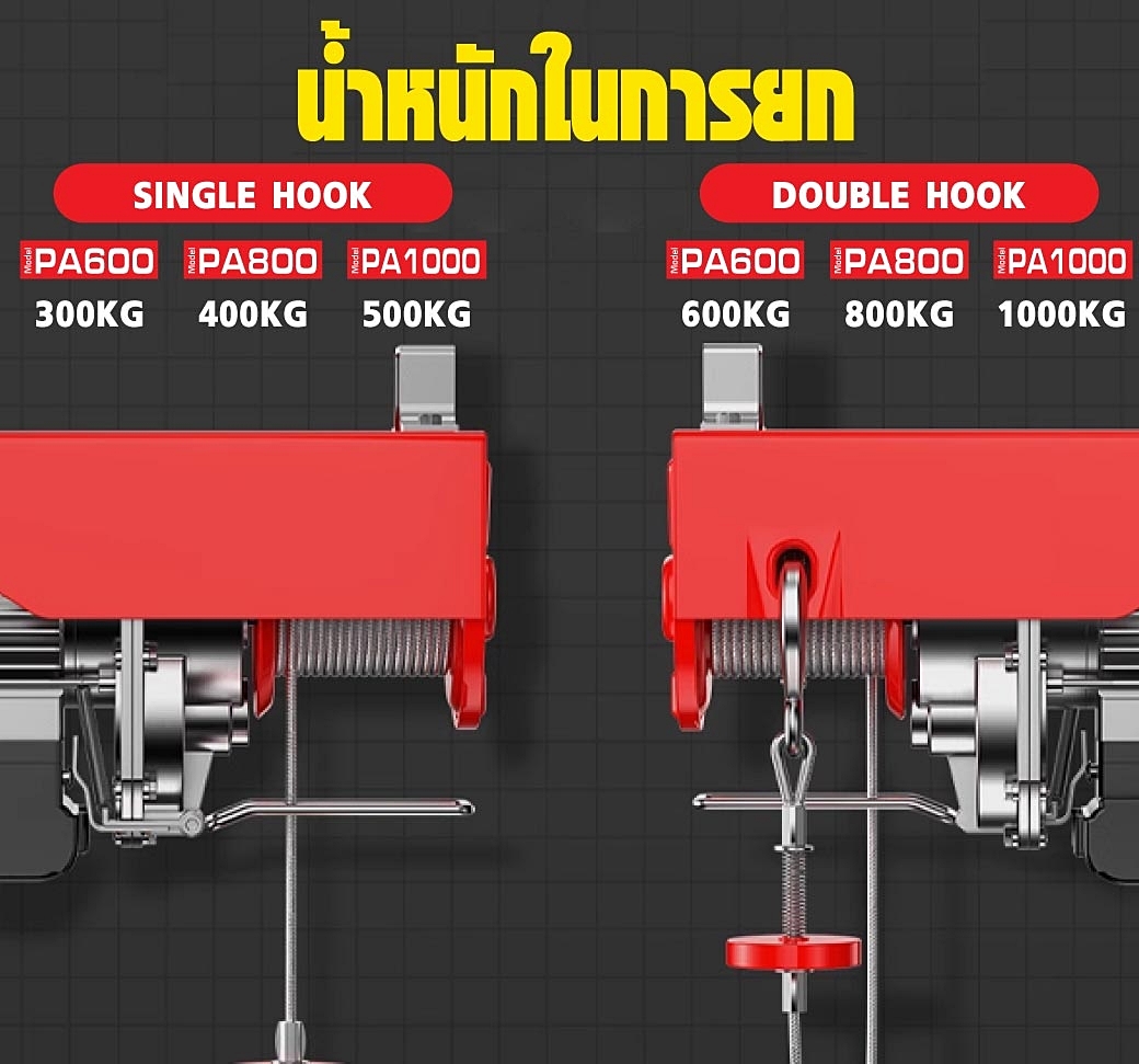 รอกสลิงไฟฟ้า 1000 กก. รุ่น PA1000 ไม่มีระบบเรียงตัวของเส้นสลิงอาจะทำให้เกิดการขัดกันของสลิง และขาดได้